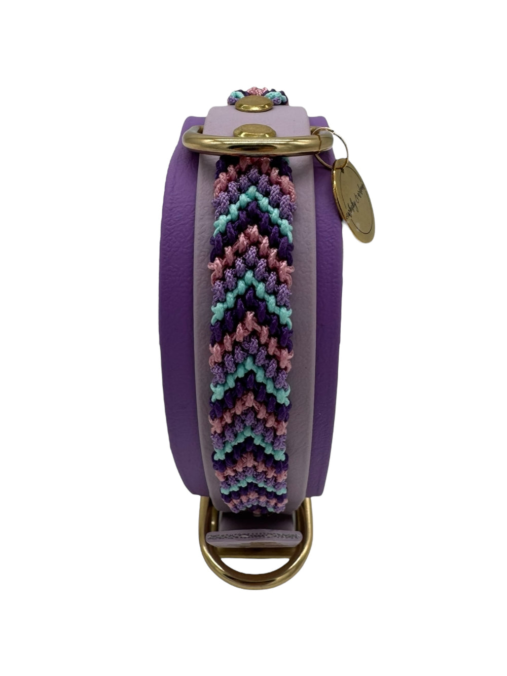 Unser Halsband ALMA (Wilma's Version) besteht aus lila- und fliederfarbenem Biothane - einem besonders robusten Material, das bei Wind und Wetter genutzt werden kann. Die Hardware ist gold.