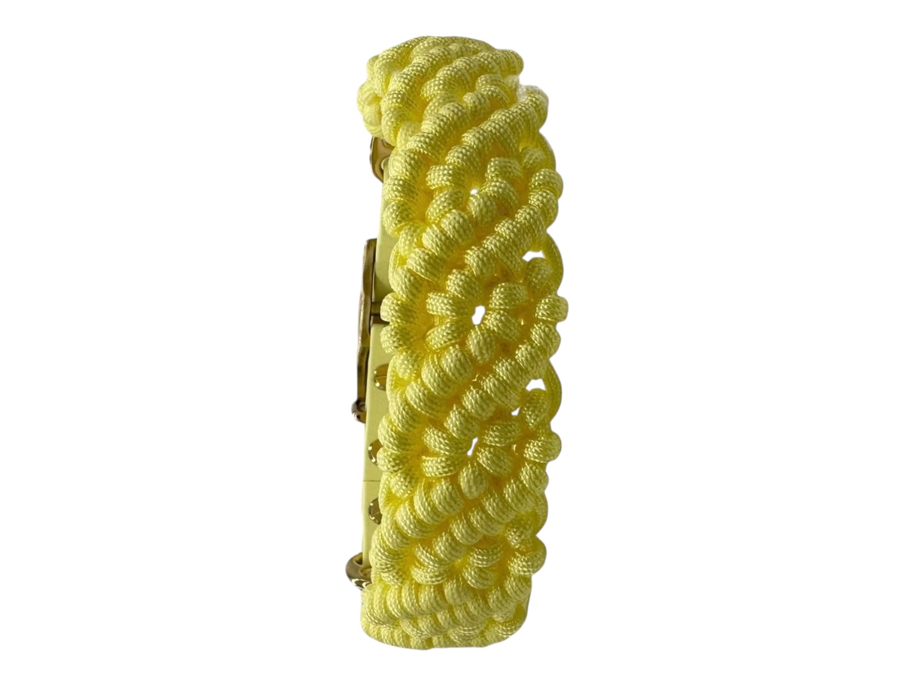 NALA besteht aus einem wunderschönen pastellgelbem Paracord - einem besonders robusten Material. Der Adapter besteht aus Biothane und die Hardware ist gold.