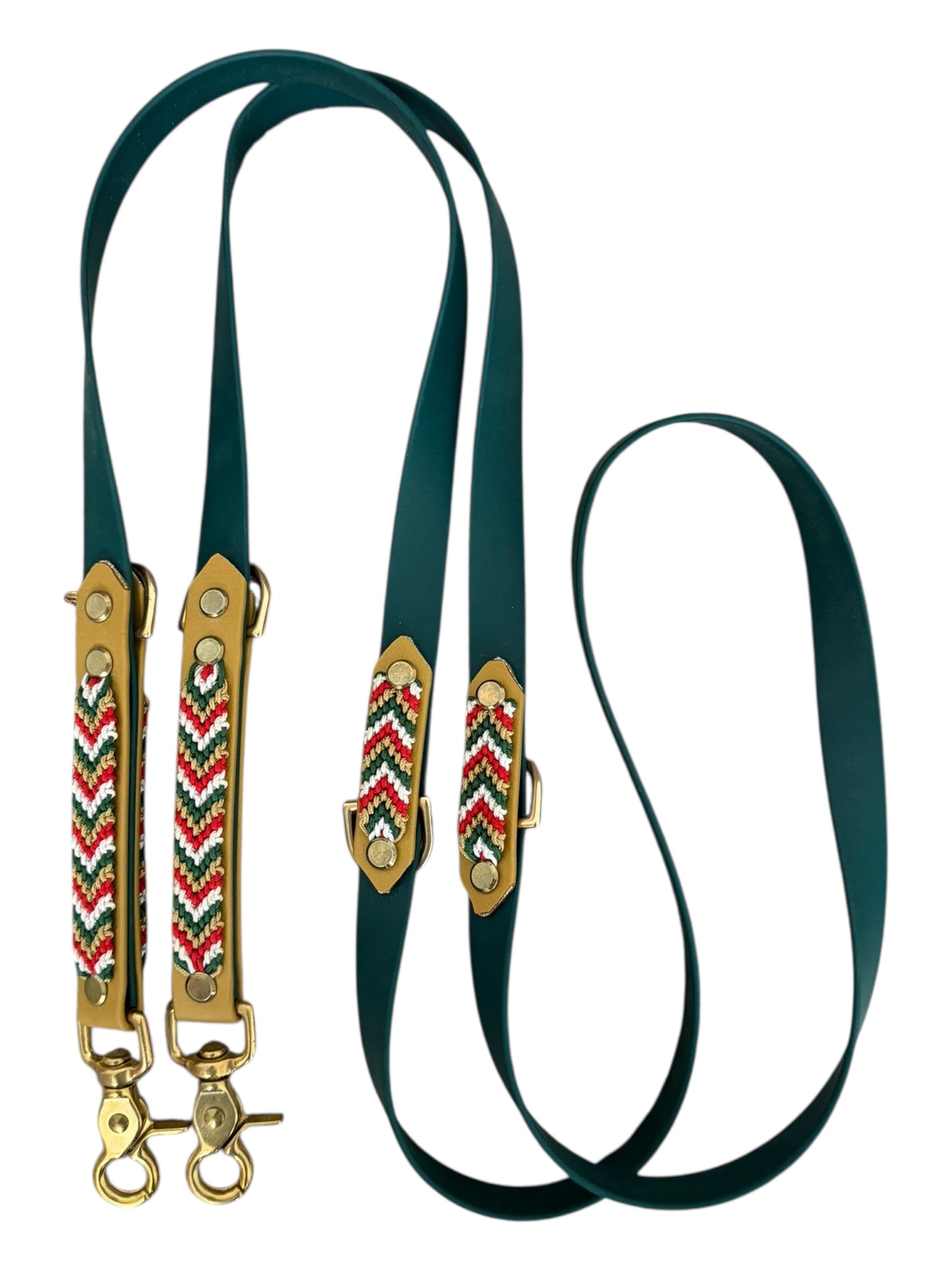 Unsere ALMA Leine der The Christmas Collection besteht aus grünem und goldfarbener Biothane - einem besonders robusten Material, das bei Wind und Wetter genutzt werden kann.