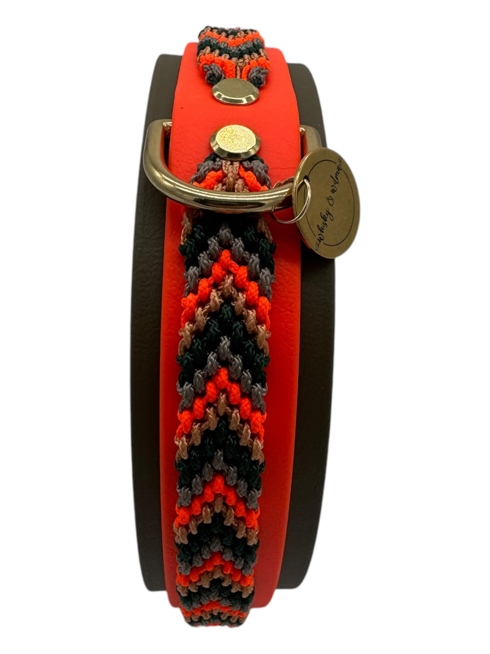 Unser Halsband ALMA (Whisky's Version) besteht aus olivgrün- und neon-orangefarbenem Biothane - einem besonders robusten Material, das bei Wind und Wetter genutzt werden kann. Die Hardware ist gold.